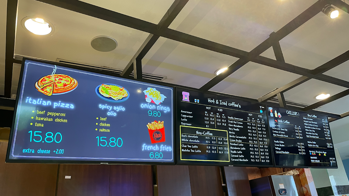 Items are generally organized into beverage options and food categories. Beverages focus primarily on various coffee blends, while the food menu includes both Western and Asian-style dishes. This setup supports quick orders as well as more relaxed dining experiences within the café setting.